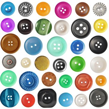 Variety of buttons types. Including wood, horn, metal, plastics, and novelties. Made In Germany.